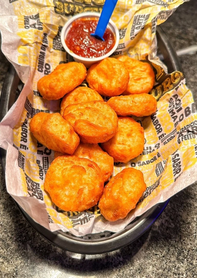 Prove o delicioso frango empanado: ÚNICO! SABOROSO! SUCULENTO! Acompanha potinho de geleia de pimenta artesanal!