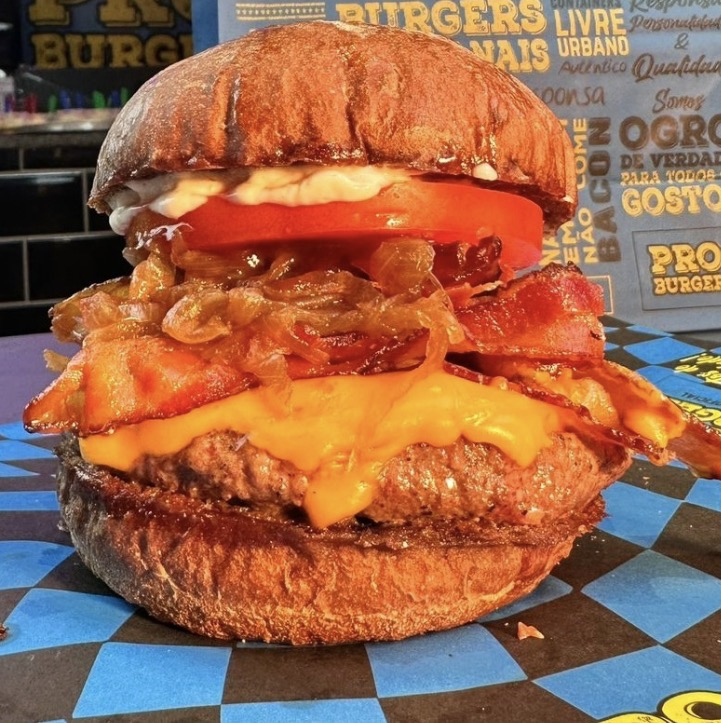 Pão Australiano, Burger de Costela 150g, Queijo Cheddar, Bacon, Cebola Caramelizada, Tomate, BBQ CaseiroPRO e Maionese Artesanal de Bacon.