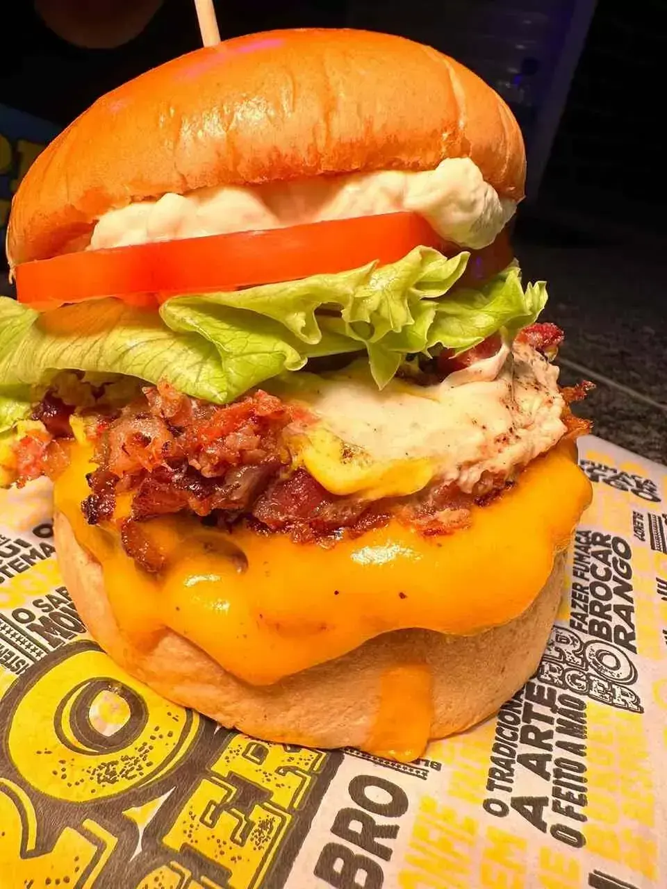 Pão Branco, Burger de costela 150g, Queijo Cheddar, Maionese de Limão, Ovo frito Junto com mix de Bacon em cubos, Salada fresca de Alface e Tomate.